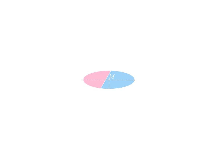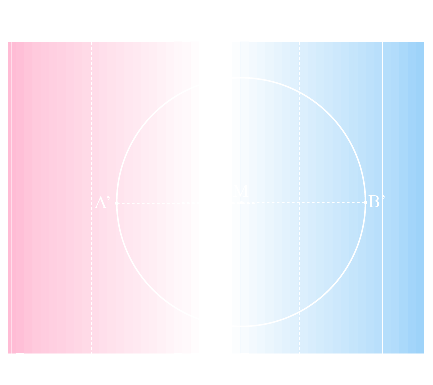 Neste segundo plano, então, demarcaremos não só o 0,1 do homem com h minúsculo, mas também cada estriamento produzido pelo deslocamento desse segmento até o número inteiro 1, o Homem com H maiúsculo, que olha por todes nós. No centro, traçaremos a marca sobressignificante da castração, a linha T, que corta o falo ou o desejo, para induzir, em cada lado, a falta ontológica que a metade tolhida agora lhe faz. Iremos colorir a porção à esquerda de rosa e à direita de azul, para que vejamos com mais clareza as duas formas molares fundamentais deste plano, aquela do par conjugal, epítome do binarismo de gênero, pela qual somos triangulades pelo macho e pela fêmea, pelo papai e pela mamãe, pelo Homem e pela Mulher. Tendo estabelecido essa tábua universal de valores organizados em conjuntos binários, o Homem sobrecodifica os diferentes indivíduos através da captura de seus movimentos de transição (descodificação, negação afirmativa de valores) em uma única intransitividade (recodificação, numerador de sobrescrição). Desse modo, podemos entender como as imagens são capturadas em C, já que agora temos um sistema fechado de medição, pelo qual podemos projetar uma lembrança qualquer no plano e, dela, obter sua maior porção através da média (M) das extremidades da seção (A’B’).