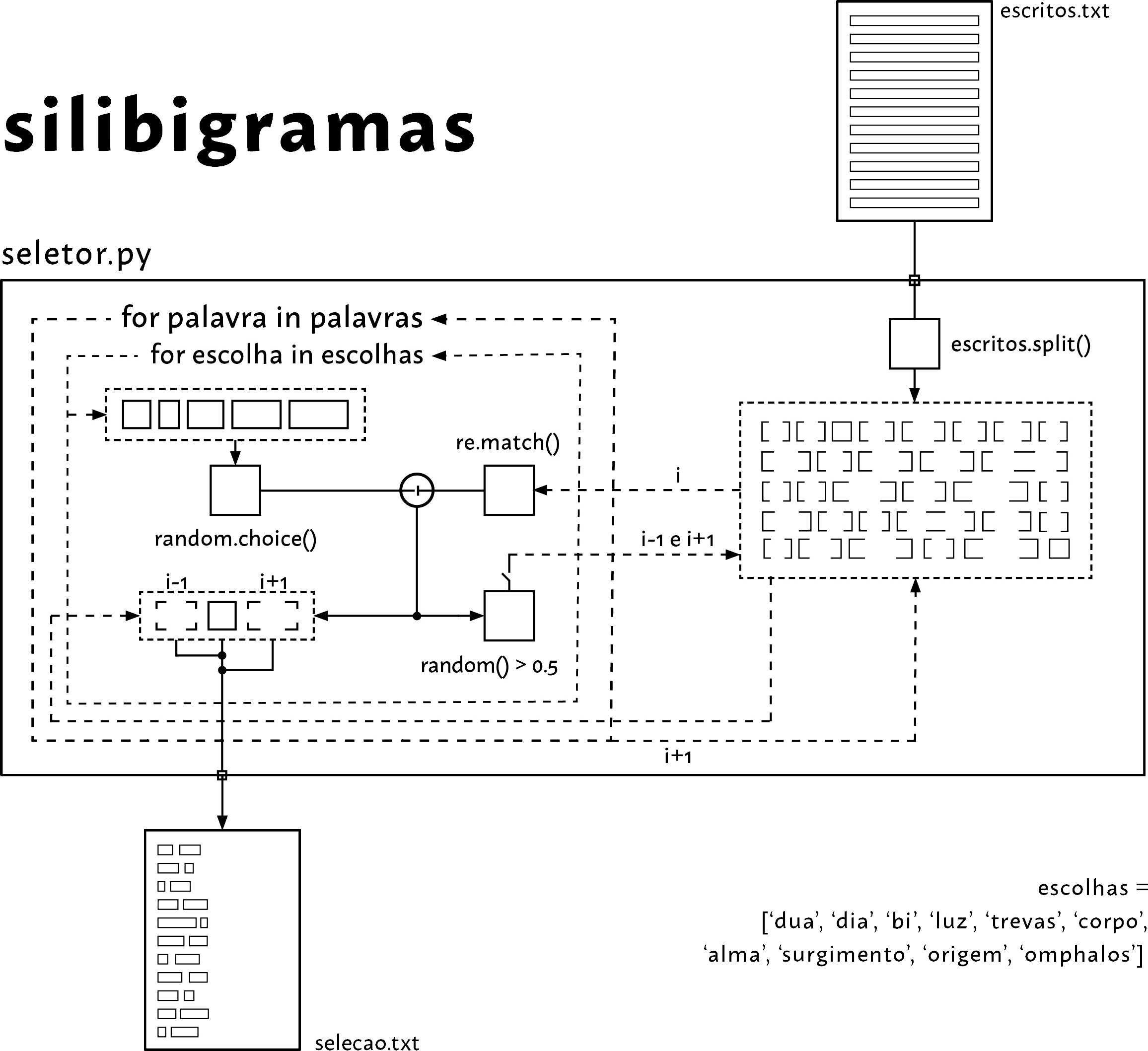O presente texto foi processado por cadeias de Markov com base no conteúdo extraído das páginas referentes às pesquisas no Google por: ‘Alma’, ‘Binarismo’, ‘Corpo’, ‘Dialética’, ‘Dualismo’, ‘Genesis’, ‘Homem das Cavernas’, ‘Humano’, ‘Luz’, ‘Neandertal’, ‘Neolítico’, ‘Omphalos’, ‘Origem’, ‘Paleolítico’, ‘Pré-história’, ‘Primitivo’, ‘Rupestre’, ‘Símio’, ‘Surgimento’, ‘Território’, ‘Trevas’. A seguir, foi processado por um algoritmo seletor que reuniu apenas pares de bigramas com palavras iniciadas pelas sílabas: ‘alma’, ‘bi’, ‘corpo’, ‘dia’, ‘dua’, ‘luz’, ‘omphalos’, ‘origem’, ‘surgimento’, ‘trevas’. Cada bigrama escolhido implica 50% de chance de escolher mais um par adjacente ao original – assim como este último implica mais 50% de chance e assim por diante. Por fim, o texto foi recortado em 6 grandes trechos reunidos pela artista.