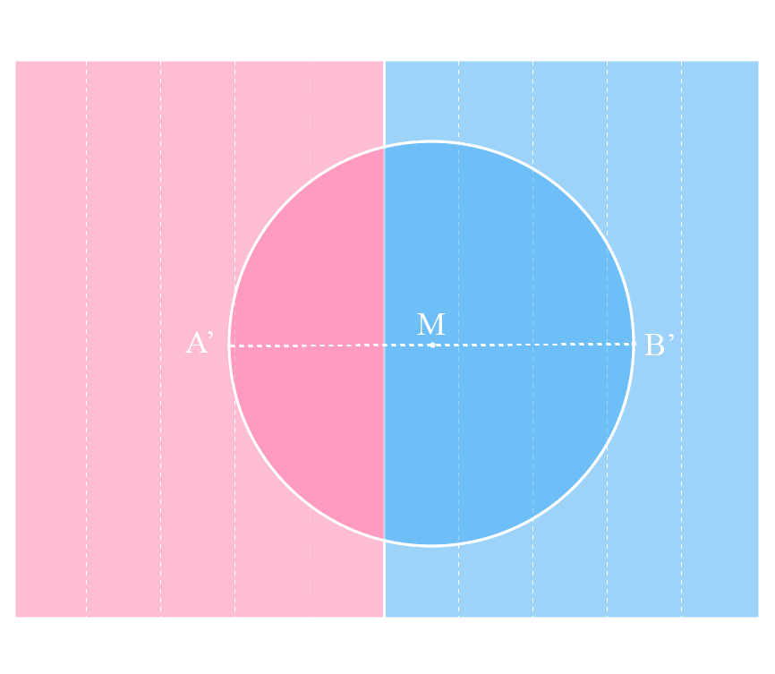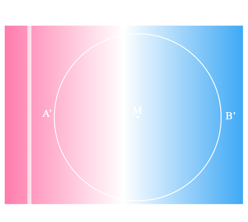 Neste segundo plano, então, demarcaremos não só o 0,1 do homem com h minúsculo, mas também cada estriamento produzido pelo deslocamento desse segmento até o número inteiro 1, o Homem com H maiúsculo, que olha por todes nós. No centro, traçaremos a marca sobressignificante da castração, a linha T, que corta o falo ou o desejo, para induzir, em cada lado, a falta ontológica que a metade tolhida agora lhe faz. Iremos colorir a porção à esquerda de rosa e à direita de azul, para que vejamos com mais clareza as duas formas molares fundamentais deste plano, aquela do par conjugal, epítome do binarismo de gênero, pela qual somos triangulades pelo macho e pela fêmea, pelo papai e pela mamãe, pelo Homem e pela Mulher. Tendo estabelecido essa tábua universal de valores organizados em conjuntos binários, o Homem sobrecodifica os diferentes indivíduos através da captura de seus movimentos de transição (descodificação, negação afirmativa de valores) em uma única intransitividade (recodificação, numerador de sobrescrição). Desse modo, podemos entender como as imagens são capturadas em C, já que agora temos um sistema fechado de medição, pelo qual podemos projetar uma lembrança qualquer no plano e, dela, obter sua maior porção através da média (M) das extremidades da seção (A’B’).